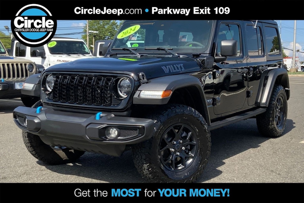 WE ARE OPEN FOR ALL YOUR SALES AND SERVICE NEEDS! COMPLETE ONLINE BUYING EXPERIENCE AVAILABLE! Circle CDJR is proud to offer this outstanding-looking and fun 2024 Jeep Wrangler an absolutely terrific-looking SUV with the following Features: Convenience Group (2-Door Passive Entry, Front Door Locks, Emergency/Assistance Call, Heated Front Seats, Heated Steering Wheel, Remote Start System, and Universal Garage Door Opener), Dual Top Group (Black 3-Piece Hard Top, Freedom Panel Storage Bag, No Soft Top, Premium Black Sunrider Soft Top w/Dual Top Group, Rear Window Defroster, and Rear Window Wiper/Washer), Quick Order Package 29W Willys (4.10 Rear Axle Ratio, 4xe 4-Wheel Drive Swing Gate Decal, 7 & 4 Pin Wiring Harness, 97 MPH Vehicle Max Speed Calibration, Auxiliary Switches, Black Grille, Conventional Differential Front Axle, E-Locker Rear Axle, Front LED Fog Lamps, LED Premium Reflector Headlamps, Molded in Color Rubicon Highline Flare, MOPAR All-Weather Floor Mats, Off-Road Plus Mode, Wheels: 17" x 7.5" Painted Black, Willy's Suspension, Willys, and Willys 4xe Hood Decal), Safety Group (Auto High Beam Headlamp Control, Blind Spot & Cross Path Detection, LED Taillamps, and ParkSense Rear Park Assist System), Technology Group (Alpine Premium Audio System and EV/PHEV Vehicle To Load), FCA US LLC Certified Pre-Owned Certified, 2.0L I4 DOHC, 4-Wheel Disc Brakes, 8 Speakers, ABS brakes, Air Conditioning, Alloy wheels, Apple CarPlay/Android Auto, Automatic temperature control, Brake assist, Cloth Low-Back Bucket Seats, Compass, Delay-off headlights, Driver door bin, Driver vanity mirror, Dual front impact airbags, Dual front side impact airbags, Electronic Stability Control, Front anti-roll bar, Front Bucket Seats, Front Center Armrest w/Storage, Front dual zone A/C, Front fog lights, Front License Plate Bracket, Front reading lights, Fully automatic headlights, Heated door mirrors, Illuminated entry, Integrated roll-over protection, Low tire pressure warning, Occupant sensing airbag, Outside temperature display, Overhead airbag, Panic alarm, ParkView Rear Back-Up Camera, Passenger door bin, Passenger vanity mirror, Power door mirrors, Power steering, Power windows, Radio data system, Radio: Uconnect 5 w/12.3" Display, Rear anti-roll bar, Rear reading lights, Remote keyless entry, Security system, Speed control, Split folding rear seat, Sport Suspension, Steering wheel mounted audio controls, Tachometer, Telescoping steering wheel, Tilt steering wheel, Traction control, Trip computer, Variably intermittent wipers, Voltmeter, and Wheels: 20" x 8" Machined/Painted Gray.