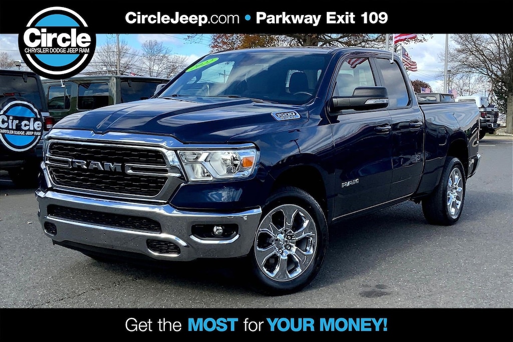 WE ARE OPEN FOR ALL YOUR SALES AND SERVICE NEEDS! COMPLETE ONLINE BUYING EXPERIENCE AVAILABLE! Circle CDJR is proud to offer this good-looking 2022 Ram 1500 a positively great Truck with the following Features: Big Horn Level 1 Equipment Group (8.4" Touchscreen Display, Apple CarPlay, Auto-Dimming Rear-View Mirror, Black Exterior Mirrors, Class IV Receiver Hitch, Convex Wide-Angle Mirror Insert, Exterior Mirrors Courtesy Lamps, Exterior Mirrors w/Heating Element, Exterior Mirrors w/Supplemental Signals, For Details, Visit DriveUconnect.com, Global Telematics Box Module (TBM), GPS Antenna Input, Integrated Center Stack Radio, Power 8-Way Driver Seat, Power Adjustable Pedals, Radio: Uconnect 5 W w/8.4" Display, Rear Power Sliding Window, SiriusXM Satellite Radio, and Sun Visors w/Illuminated Vanity Mirrors), Quick Order Package 25Z Big Horn, FCA US LLC Certified Pre-Owned Certified, 3 Rear Seat Head Restraints, 3.21 Rear Axle Ratio, 4 Way Front Headrests, 4-Wheel Disc Brakes, 48V Belt Starter Generator, 6 Speakers, ABS brakes, Air Conditioning, Alloy wheels, AM/FM radio, Brake assist, Bumpers: chrome, Cloth Bench Seat, Cluster 7.0" TFT Color Display, Compass, Connected Services Delete Credit, Delay-off headlights, Driver door bin, Dual front impact airbags, Dual front side impact airbags, Electronic Stability Control, Emergency communication system: SiriusXM Guardian, Front anti-roll bar, Front Center Armrest w/Storage, Front fog lights, Front reading lights, Front Seat Back Map Pockets, Front wheel independent suspension, Fully automatic headlights, Heated door mirrors, Illuminated entry, Integrated Voice Command w/Bluetooth, Leather steering wheel, Low tire pressure warning, Manual Adjust 4-Way Front Passenger Seat, MOPAR Front & Rear Rubber Floor Mats, Occupant sensing airbag, Outside temperature display, Overhead airbag, Overhead console, Panic alarm, ParkView Rear Back-Up Camera, Passenger door bin, Passenger vanity mirror, Power door mirrors, Power steering, Power windows, Radio data system, Radio: Uconnect 3 w/5" Display, Rear 60/40 Folding Seat, Rear anti-roll bar, Rear seat center armrest, Rear step bumper, Rear Wheelhouse Liners, Remote keyless entry, Remote Start System, Speed control, Split folding rear seat, Steering wheel mounted audio controls, Tachometer, Telescoping steering wheel, Tilt steering wheel, Traction control, Trip computer, Variably intermittent wipers, Voltmeter, Wheels: 18" x 8" Cast-Aluminum Painted, and Wheels: 20" x 9" Aluminum Chrome ClaD. Odometer is 6089 miles below market average!