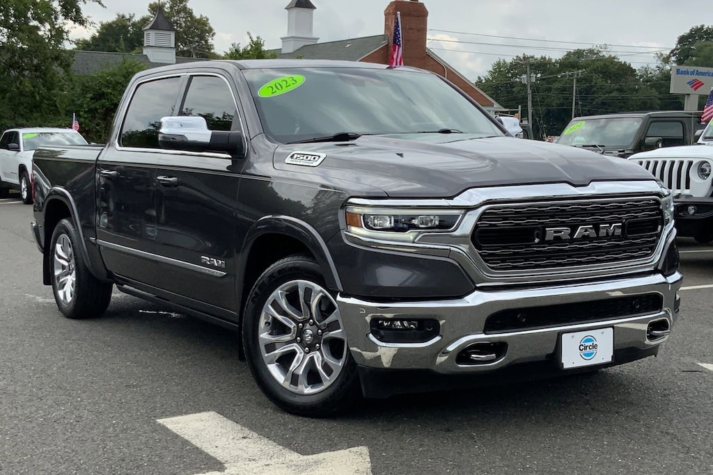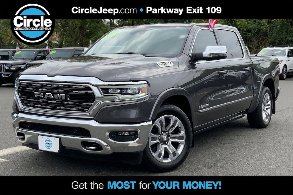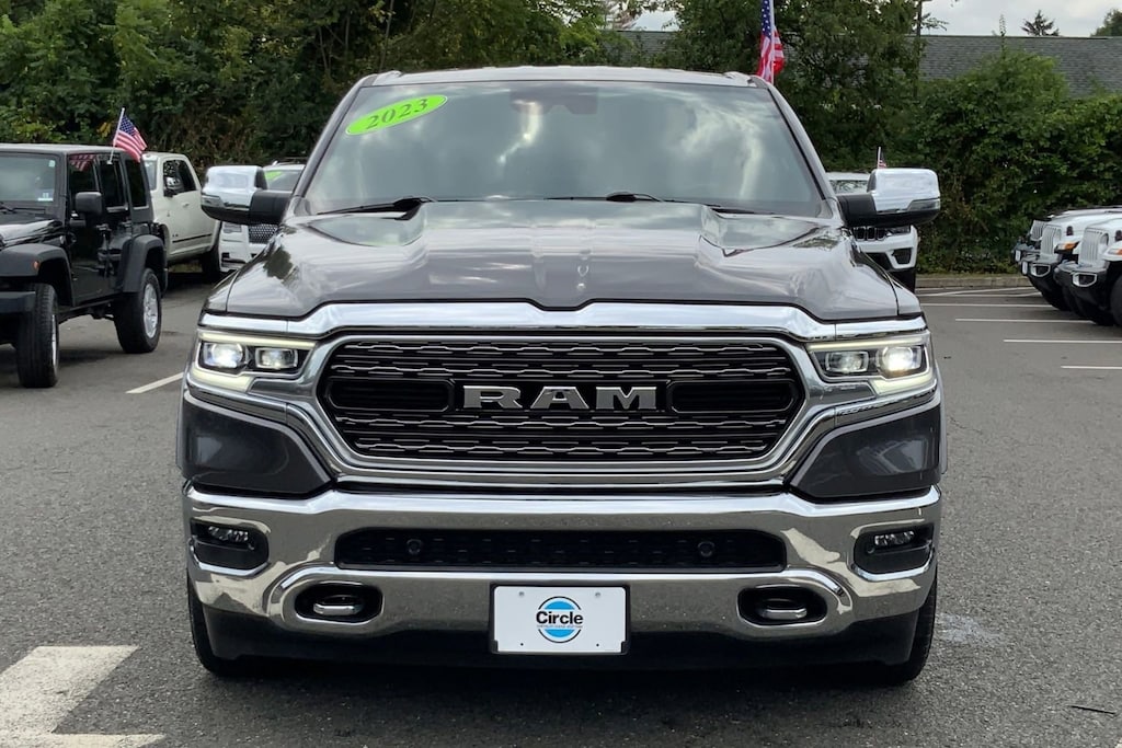 WE ARE OPEN FOR ALL YOUR SALES AND SERVICE NEEDS! COMPLETE ONLINE BUYING EXPERIENCE AVAILABLE! Circle CDJR is proud to offer this good-looking 2023 Ram 1500 a truly outstanding-looking Truck with the following Features: Quick Order Package 27M Limited, FCA US LLC Certified Pre-Owned Certified, 10 Speakers, 3.21 Rear Axle Ratio, 4 Way Front Headrests, 4-Wheel Disc Brakes, 48V Belt Starter Generator, ABS brakes, Active Noise Control System, Adjustable pedals, Air Conditioning, Alloy wheels, AM/FM radio: SiriusXM with 360L, Anti-Spin Differential Rear Axle, Apple CarPlay/Android Auto, Audio memory, Auto High-beam Headlights, Auto-dimming door mirrors, Auto-Dimming Exterior Driver Mirror, Auto-dimming Rear-View mirror, Auto-leveling suspension, Automatic temperature control, Bodyside moldings, Brake assist, Bucket Seats, Bumpers: chrome, Chrome Exterior Mirrors, Compass, Convex Wide-Angle Exterior Mirror Insert, Delay-off headlights, Driver door bin, Driver Seat Memory, Driver vanity mirror, Dual front impact airbags, Dual front side impact airbags, Dual Rear Exhaust w/Bright Tips, Electronic Stability Control, Exterior Mirrors Courtesy Lamps, Exterior Mirrors w/Heating Element, Exterior Mirrors w/Memory, Exterior Mirrors w/Supplemental Signals, Front anti-roll bar, Front Bucket Seats, Front Center Armrest w/Storage, Front dual zone A/C, Front fog lights, Front reading lights, Front Seat Back Map Pockets, Front wheel independent suspension, Full Length Premium Floor Console, Fully automatic headlights, Garage door transmitter, Genuine wood console insert, Genuine wood dashboard insert, Genuine wood door panel insert, Heated door mirrors, Heated Front Seats, Heated front seats, Heated rear seats, Heated Second Row Seats, Heated Steering Wheel, Heated steering wheel, Heavy-Duty Engine Cooling, HEMI Badge, Illuminated entry, Leather steering wheel, Low tire pressure warning, Manufacturer's Statement of Origin, Memory seat, Navigation System, Occupant sensing airbag, Outside temperature display, Overhead airbag, Overhead console, Panic alarm, ParkView Rear Back-Up Camera, Passenger door bin, Passenger vanity mirror, Passive Tuned Mass Damper, Pedal memory, Power 4-Way Driver Lumbar Adjust, Power 4-Way Passenger Lumbar Adjust, Power 8-Way Driver & Passenger Seats, Power door mirrors, Power driver seat, Power passenger seat, Power steering, Power windows, Power-Folding Mirrors, Premium Leather Trimmed Bucket Seats, Radio data system, Radio: Uconnect 5 Nav w/12.0" Display, Rain sensing wipers, Rear 60/40 Folding Split Recline Seat, Rear anti-roll bar, Rear seat center armrest, Rear step bumper, Rear window defroster, Remote keyless entry, Security system, Speed control, Split folding rear seat, Steering wheel mounted audio controls, Tachometer, Telescoping steering wheel, Tilt steering wheel, Traction control, Trailer Brake Control, Trip computer, Turn signal indicator mirrors, Variably intermittent wipers, Ventilated Front Seats, Ventilated front seats, Ventilated Rear Seats, Ventilated rear seats, Voltmeter, and Wheels: 20" x 9" Aluminum Painted/Polished. Odometer is 7978 miles below market average!