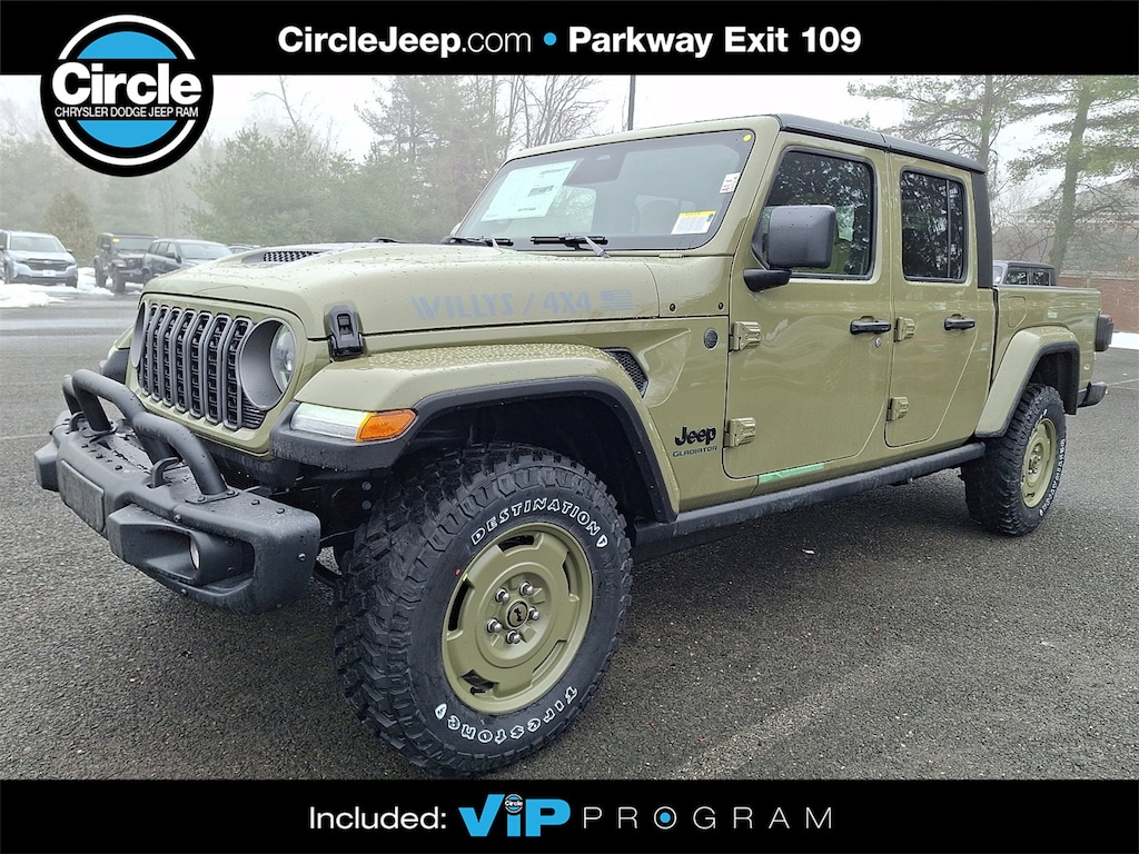 WE ARE OPEN FOR ALL YOUR SALES AND SERVICE NEEDS! COMPLETE ONLINE BUYING EXPERIENCE AVAILABLE! Circle CDJR is proud to offer this great 2026 Jeep Gladiator a truly wonderful-looking Truck with the following Features: Convenience Group (Air Conditioning with Auto Temp Control, Cluster 7.0" TFT Color Display, Corning Gorilla Glass, Daytime Running Lamp System, Emergency/Assistance Call, Front Door Locks 2-Door Passive Entry, Heated Front Seats, Heated Steering Wheel, Remote Start System, and Universal Garage Door Opener), Quick Order Package 24T Willys 41 (2-Piece Body Color Fender Flares, 4WD Willys '41 Tailgate Decal, 97 Mph Vehicle Max Speed Calibration, Advanced Brake Assist, Automatic Headlamps, Auxiliary Switches, Central ADAS Decision Module (CADM), Class IV Receiver Hitch, Cloth Low-Back Bucket Seats, Daytime Running Lamps LED Accents, Deep Tint Sunscreen Windows, E-Locker Rear Axle, Front Heavy Duty Red Accent Shock Absorbers, Front LED Fog Lamps, Full Speed Forward Collision Warning Plus, Green Soul Cloth Wrapped Mid-Bolster, Heavy-Duty Engine Cooling, LED Premium Reflector Headlamps, LED Taillamps, MOPAR All-Weather Slush Mats, MOPAR Black Hood Graphic, MOPAR Triple Hoop Grille Guard, Off-Road Plus Mode, Performance Hood, Power Heated Mirrors, Premium Wrapped Steering Wheel, Protection Sill Rails, Rear Heavy Duty Red Accent Shock Absorbers, Security Alarm, Steel Front Bumper, Sun Visors with Illuminated Vanity Mirrors, Trailer Hitch Zoom, Wheels: 17" x 7.5" Fully Painted, Willys '41, Willys '41 Retro Edition Gladiator Decal, Willys '41 US Edition U.S. Hood Decal, and Willys Suspension), Safety Group (Auto High Beam Headlamp Control, Blind Spot and Cross Path Detection, and ParkSense Rear Park Assist System), 110 Mph Vehicle Max Speed Calibration, 12.3" Touchscreen Display, 3.73 Rear Axle Ratio, 4-Wheel Disc Brakes, 4G LTE Wi-Fi Hot Spot, 8 Speakers, ABS brakes, Air Conditioning, Alexa Built-in, Alpine Premium Audio System, AM/FM radio: SiriusXM with 360L, Apple CarPlay, Apple CarPlay/Android Auto, Black 3-Piece Hard Top, Brake assist, Compass, Connectivity - US/Canada, Delay-off headlights, Driver door bin, Driver vanity mirror, Dual front impact airbags, Dual front side impact airbags, Electronic Stability Control, For Details, Visit DriveUconnect.com, Freedom Panel Storage Bag, Front anti-roll bar, Front Bucket Seats, Front Center Armrest w/Storage, Front fog lights, Front License Plate Bracket, Front reading lights, Google Android Auto, Illuminated entry, Integrated Center Stack Radio, Integrated roll-over protection, Low tire pressure warning, Manufacturer's Statement of Origin, MOPAR Spray in Bedliner, MyFlexCare Service Plan, Normal Duty Suspension, Occupant sensing airbag, Outside temperature display, Overhead airbag, Panic alarm, ParkView Rear Back-Up Camera, Passenger door bin, Passenger vanity mirror, Power steering, Power windows, Radio data system, Radio: Uconnect 5 with 12.3" Display, Rear anti-roll bar, Rear reading lights, Rear Sliding Window, Rear Window Defroster, Remote keyless entry, SiriusXM Radio Service, SiriusXM with 360L, Speed control, Split folding rear seat, Steering wheel mounted audio controls, Tachometer, Telescoping steering wheel, Tilt steering wheel, Traction control, Trip computer, USB Host Flip, Variably intermittent wipers, Voltmeter, and Wheels: 17" x 7.5" Black Steel StyleD. Price includes: $2000 - 2026 National Select Inventory Bonus Cash. Exp. 03/02/2026