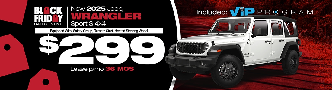 Price includes all costs to be paid by consumer except tax, title and license fees. Offer available to well qualified buyers with approval through Stellantis Financial Services. Based on closed end lease. $4889 Due at signing w/$3995 down plus first month's payment, $0 Sec. Dep. and $595 acquisition fee. Total Payments: $10,764. Total Cost: $15,354. P/Option Available at Lease End: $37,654.85. Lease Includes $2000 Select Inventory Bonus Cash if qualified. 7500 miles a year/30¢ per mi. thereafter. Lessee responsible for excess wear & tear. $395 Disposition Fee at Lease End. Must qualify for all incentives. See dealer for details. Not responsible for typographical errors. Expires 12/1/25.