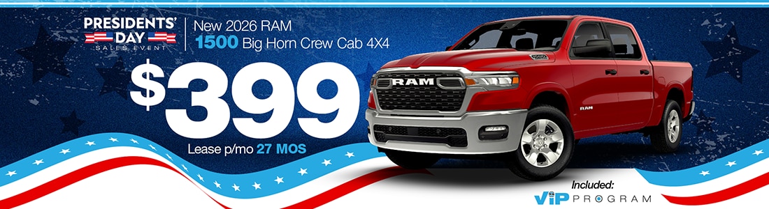 Price includes all costs to be paid by consumer except tax, title and license fees. Offers available to well qualified buyers with approval through Stellantis Financial Services. Based on closed end lease. $4993 Due at signing w/$3999 down plus first month's payment, $0 Sec. Dep. and $595 acquisition fee. Total Payments: $10,773. Total Cost: $15,367. P/Option Available at Lease End: $36,935. Lease Includes $2000 Lease Loyalty Bonus Cash if qualified. 7500 miles a year/30¢ per mi. thereafter. Lessee responsible for excess wear & tear. $395 Disposition Fee at Lease End. Must qualify for all incentives. See dealer for details. Not responsible for typographical errors. Expires 3/2/26.