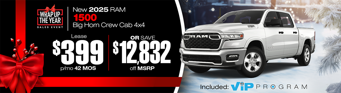 Price includes all costs to be paid by consumer except tax, title and license fees. Offers available to well qualified buyers with approval through Stellantis Financial Services. Buy price includes $4817 Dealer Discount, $2000 2025 National Holiday Select Inventory Bonus Cash & $6015 2025 National 10% Below MSRP. Based on closed end lease. $4989 Due at signing w/$3995 down plus first month's payment, $0 Sec. Dep. and $595 acquisition fee. Total Payments: $16,758. Total Cost: $21,348. P/Option Available at Lease End: $32,841. Lease Includes $2000 Select Inventory Bonus Cash & $2000 Returning Lessee Bonus Cash if qualified. 7500 miles a year/30¢ per mi. thereafter. Lessee responsible for excess wear & tear. $395 Disposition Fee at Lease End. Must qualify for all incentives. See dealer for details. Not responsible for typographical errors. Expires 1/5/26.
